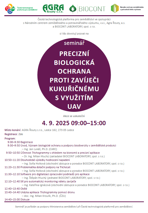Pozvánka s programem v PDF ke stažení: 2025 Seminář Precizní biologická ochrana proti zavíječi kukuřičnému s využitím UAV